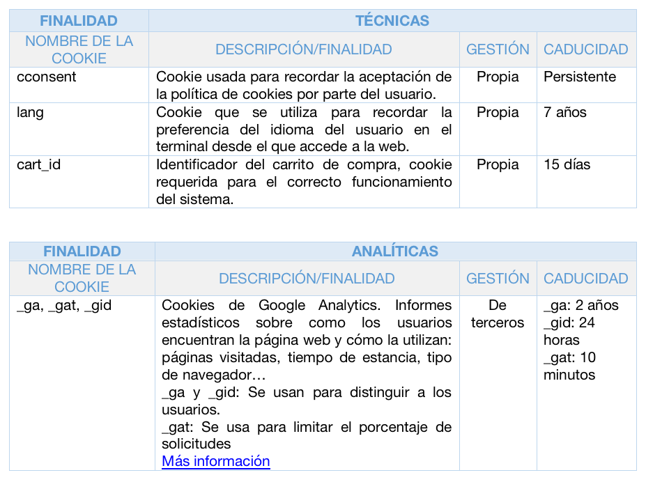 En esta web se utilizan las siguientes cookies